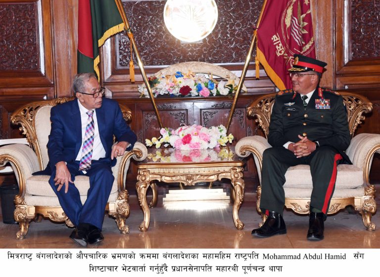 बंगलादेश भ्रमणमा रहनुभएका प्रधान सेनापति पूर्णचन्द्र थापाले त्यहाँका राष्ट्रपति मोहमद अब्दुल हमिदसँग भेट गर्नुभएको छ।