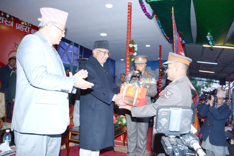 प्रधानमन्त्री केपी शर्मा ओली सशस्त्र प्रहरी बल नेपाल प्रधानकार्यालयमा बिहीबार आयोजित ‘१९औं सशस्त्र प्रहरी दिवस २०७६’ विशेष समारोहमा सरिक हुनुभएको छ।प्रधानमन्त्री ओलीले उक्त विशेष समारोहमा यसवर्ष उत्कृष्ट बाहिनी घोषित सशस्त्र प्रहरी बल नेपाल नम्बर २ छिन्नमस्ता बाहिनी मुख्यालयका बाहिनीपति सशस्त्र प्रहरी नायव महानिरीक्षक राजु अर्याललाई ‘उत्कृष्ट बाहिनी अवार्ड’ प्रदान गर्नुभयो।