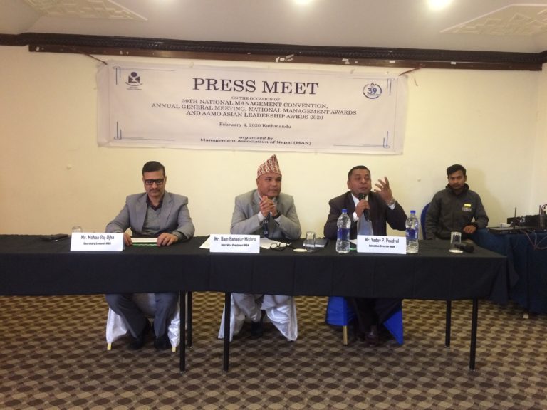नेपालका व्यवस्थापकहरुको छाता संस्थाको रुपमा रहेको नेपाल व्यवस्थापन संघले विभिन्न कार्यक्रमको आयोजना गर्ने भएको छ । संघले यही माघ २४ गते ३९ औं राष्ट्रिय व्यवस्थापन सम्मेलन, बार्षिक साधारण सभा, राष्ट्रिय व्यवस्थापन पुरस्कार तथा सम्मान र एशियाली व्यवस्थापन संघद्धारा आयोजित एशियाली नेतृत्व पुरस्कार साँझ २०२० आयोजना गर्ने भएको मंगलबार राजधानीमा एक पत्रकार सम्मेलनको आयोजना गरी जानकारी दिएको हो ।