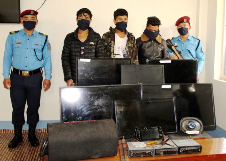 जिल्ला प्रहरी कार्यलय धादिङले लकडाउनको अवधिका ६ थान एलईडी टेलिभिजन चोरी गरेको आरोपमा प्रहरीले ३ जनालाई पक्राउ गरेको छ । एलईडी टेलिभिजन सहित उनीहरुलाई सिद्धलेक गाउँपालिकाबाट पक्राउ गरिएको जिल्ला प्रहरी कार्यालय धादिङले जनाएको हो ।