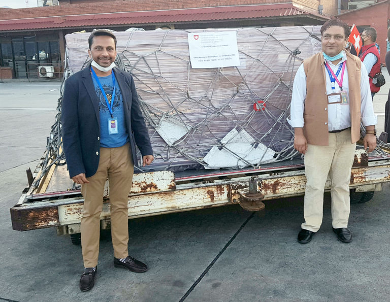 प्रिज्मा एड्भरटाइजिङका प्रमुखकार्यकारी रञ्जितआचार्य, नेपालवायु सेवानिगम, स्विस दूतावास तथा रोचे फर्मास्युटिकल्सको सहयोगमाती सामग्री सिंगापुरबाट मलेसियाहुँदै काठमाडौं आइपुगेको हो। स्विस दूतावासका राजदूतले स्वास्थ्यमन्त्रीलाई बिहीबार सो सामग्री हस्तान्तरण गरेको हो।
