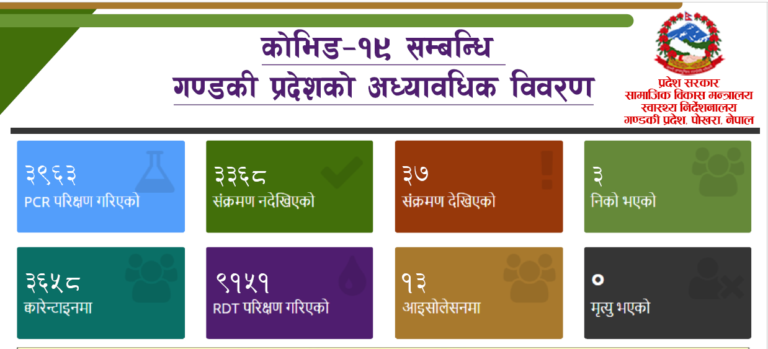 गण्डकी प्रदेशको कोरोना संक्रमणको अध्यावधिक अनुसार पिसिआर परिक्षण ३ हजार ९ सय ६३ मा संक्रमितको कुल संख्या ३७ र निको भएका ३ जना रहेका छन् । त्यसैगरी क्वारेन्टाईनमा ३ हजार ६ सय ५८ जना रहेका छन् भने आरडिटि परिक्षण ९ हजार १ सय ५१ जनाको भएको र १३ जना आइसोलेसनमा राखिएको छ ।