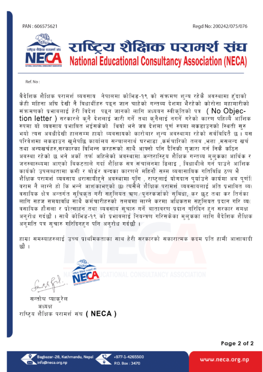 राष्ट्रिय शैक्षिक परामर्श संघ (एनईसीए)ले शैक्षिक परामर्श व्यवसायलाई कोरोना संक्रमणबाट सिर्जित लकडाउनका कारण अति प्रभावित ब्यवसायिक क्षेत्र अन्तर्गत सुचिकृत गरी सहुलियत ऋण उपलब्ध गराउन सरकारसँग माग गरेको छ ।