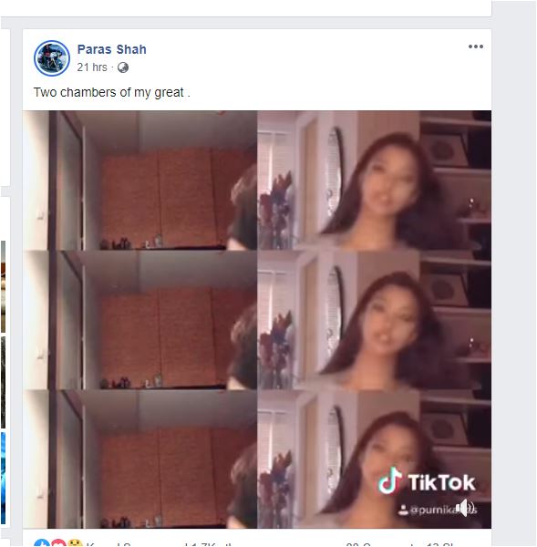 छोरी पुर्णिका र कृतिका शाहको टिकटक एकाउन्टमा राखिएको भिडियो धेरै भए पछी पूर्व युवराज पारस शाहले पनि सामाजिक संजालमा लब साइन सहित उक्त टिकटक भिडियो आफ्नो प्रोफाइलमा राखेका छन ।