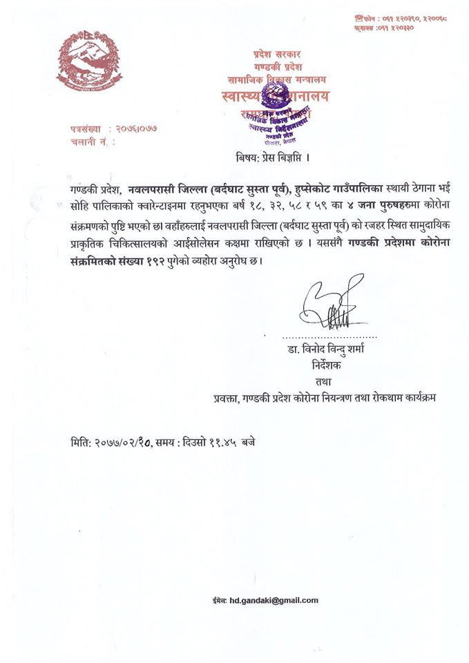 गण्डकी प्रदेशमा ४ जना कोरोना संक्रमित थपिएका छन । नवलपरासीको सूस्ता पूर्वको हुप्सेकोट गाउँपालिका ठेगाना भइ सोही गाउँपालिकाको क्वारेन्टाईनमा बस्दै आएका ४ जना पुरुषमा कोरोना संक्रमण देखिएको हो ।