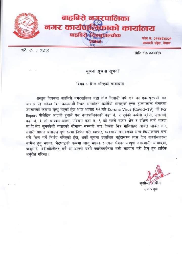 केहिदिन अघि मृत्यु भएका बाह्रबिसे नगरपालिका ४ का ८४ बर्षीय पुरुषमा कोरोना संक्रमण पुष्टि भएपछी बाह्रबिसे नगरपालिकाको ४ नम्बर वडा सिल गरिएको छ । २३ साउनमा काठमाडौ स्थित मनमोहन कार्डियो भाष्कुलर एन्ड ट्रान्स्प्लान्ट सेन्टरमा उपचारका क्रममा मृत्यु भएका पुरुषमा कोरोना संक्रमण पुष्टि भएपछि बाह्रबिसे नगरपालिकाको ४ नम्बर वडा सिल गरिएको हो ।