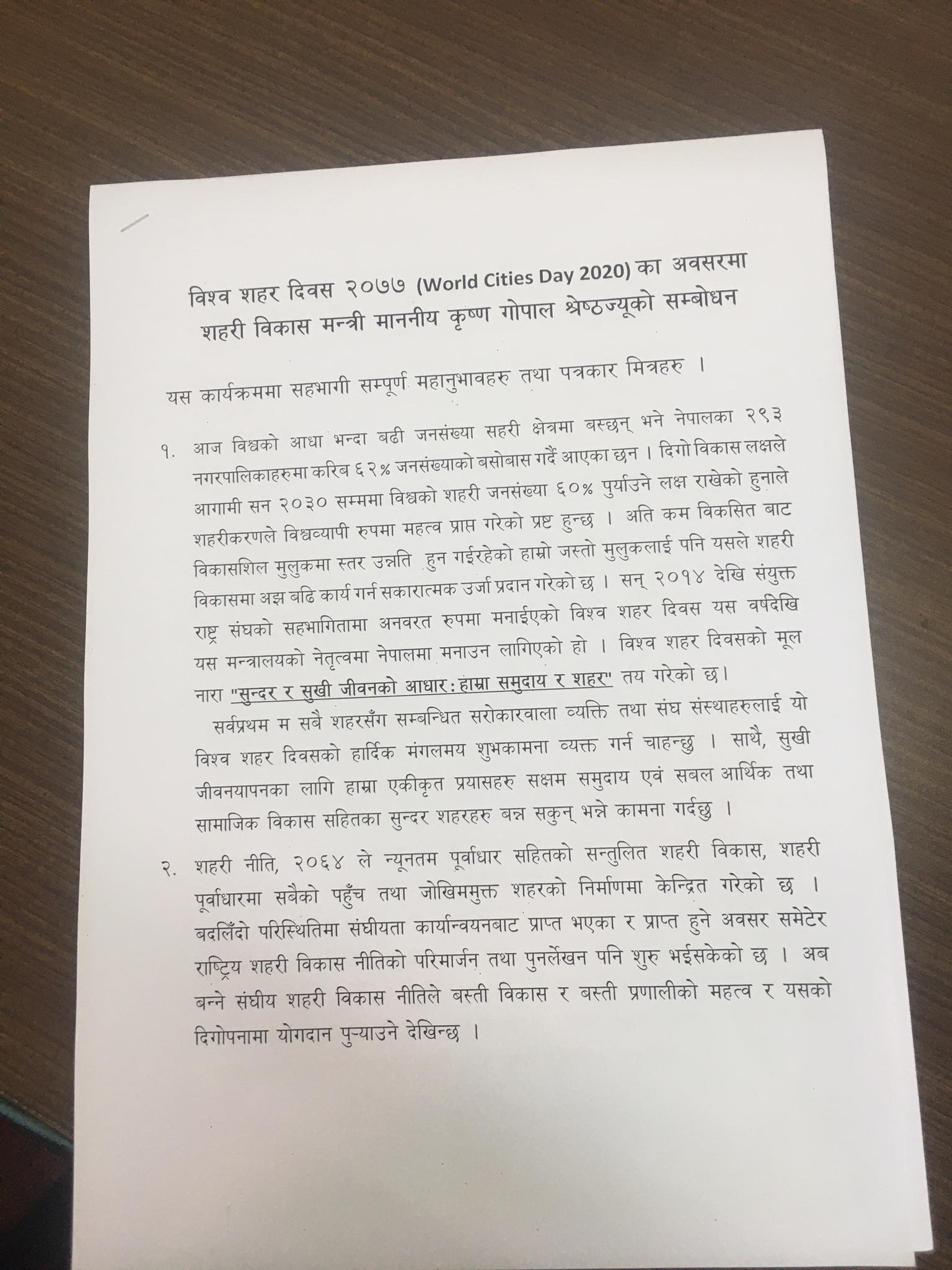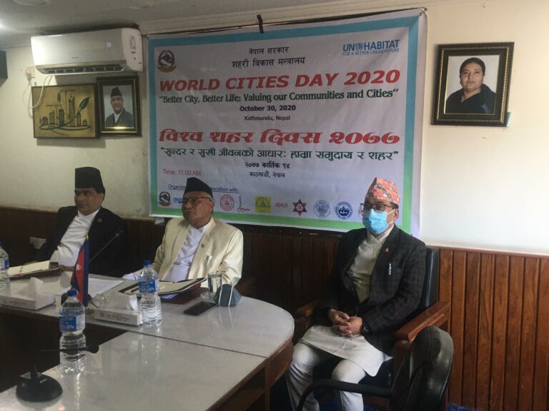 विश्व शहर दिवस २०७७ को अवसरमा आयोजना गरिएको एक कार्यक्रममा बोल्दै मन्त्री श्रेष्ठले सो क्रा बताएका हुन् । शहरी विकास मन्त्रालयको नेतृत्वमा यसै वर्षदेखि नेपालमा समेत यो दिवस मनाउन लागिएको श्रेष्ठले जनाएका छन् । मन्त्रालयले सुन्दर र सुखी जीवनको आधार हाम्रा समुदाय र शहर भन्ने मूल नारा तयार पारेको छ ।