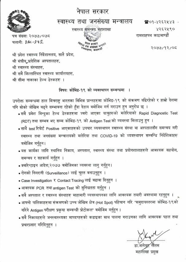 स्वास्थ्य तथा जनसंख्या मन्त्रालयले भारतमा कोरोना भाईरसका बिरामीको परिवर्तित स्वरुप बढेसँगै नेपालमा पनि बढ्न सक्ने प्रवल सम्भावना रहेकाले हरेक नाकामा मलेरिया र कोरोनाको एन्टीजिन परिक्षणका लागि निर्देशन दिएको छ । स्वास्थ्य तथा जनसंख्या मन्त्रालयका प्रवक्ता प्राडा जागेश्वर गौतमले आईतबार सातै प्रदशेका स्वास्थ्य निर्देशनालय, संघीय प्रादेशिक अस्पतालहरु, स्वासथ्य संस्थाहरु, सबै जिल्लास्थित स्वास्थ्य कार्यालयहरु र सिमा नाकाका हेल्थ डेस्कहरु पत्राचार गर्नुभएको छ ।