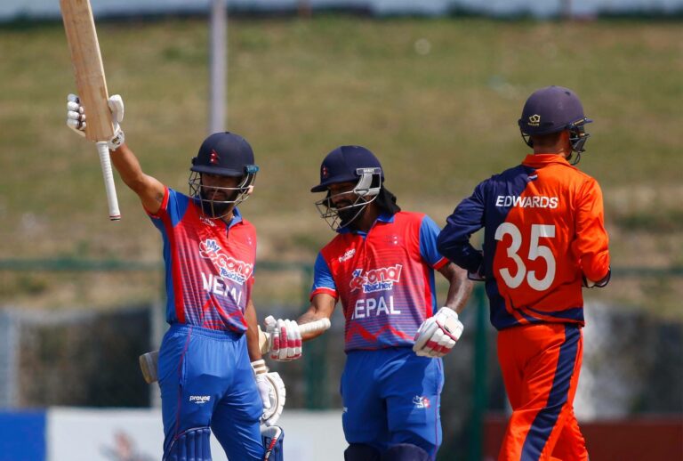 काठमाडौं । घरेलु मैदानमा जारी त्रिकोणात्मक टी–ट्वान्टी सिरिजअन्तर्गत आज भएको तेस्रो खेलमा नेपाल नेदरल्यान्ड्ससँग पराजित भएको छ । कीर्तिपुरस्थित त्रिवि मैदानमा भएको खेलमा नेपाल नेदरल्याण्ड्ससँग तीन विकेटले पराजित भएको हो । नेपालले दिएको २०७ रनको लक्ष्य नेदरल्यान्ड्सले १९ दशमलव ३ ओभरमा सात विकेट गुमाएर पूरा ग-यो । नेदरल्यान्ड्सको जितका लागि बास डी लिड र बेन कुपर नायक बने ।
