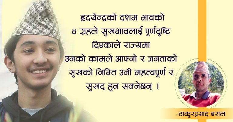 यसरी ज्योतिष विधाका विभिन्न योग, उपयोगहरू हेर्दा भविष्य पुस्तामा पूर्व नवयुवराज हृदयेन्द्र जनता सामु नेतृत्वकारी लोकप्रिय नेताका रूपमा स्थापना हुने सम्भावनाहरूलाई नकार्न सकिदैन।