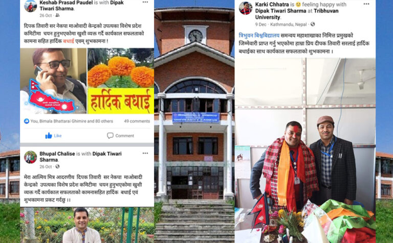 त्रिभुवन विश्वविद्यालयका महत्वपूर्ण महाशखाका प्रमुख नेकपा माओवादी उपत्यका विशेष केन्द्रको प्रदेश कमिटीको सदस्य भएको खुलेको छ । त्रिवि समन्वय महाशाखाको निमित्त प्रमुखको जिम्मेवारीमा रहनुभएका दीपक तिवारी पार्टीको महत्वपूर्ण जिम्मेवारीमा रहनुभएको छ । त्रिविका शिक्षक र कर्मचारीको अध्ययन वा कुनै बिदा बस्दा स्वीकृत गर्ने जस्तो महत्वपूर्ण जिम्मेवारीमा रहनुभएका निमित्त प्रमुख तिवारीलाई प्रदेश कमिटीको सदस्य भएपछि फेसबुकमै बधाई दिइएको छ ।