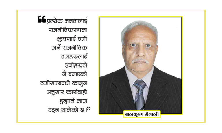 प्रत्येक जनतालाई राजनीतिकरुपमा झुक्याई ठगी गर्ने राजनीतिक ठगहरुलाई उनीहरुले नै बनाएको ठगीसम्बन्धी कानुन अनुसार कार्यवाही हुनुपर्ने माग उठ्न थालेको छ ।