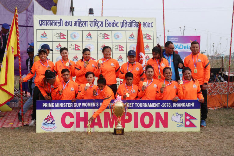 नेपाल एपीएफ क्लब धनगढीमा भएको ‘पीएम कप महिला राष्ट्रिय टी–२० क्रिकेट प्रतियोगिता’मा विजेता बनेको छ । आइतबार भएको फाइनल खेलमा विभागीय टिम एपीएफले गत संस्करणको विजेता टिम प्रदेश नम्बर एकलाई ७ विकेटले स्तब्ध तुल्याएको हो । मात्र ६८ रनको सामान्य लक्ष्य एपीएफले १४.२ ओभरमा ३ विकेटको नोक्सानीमा पूरा गरेको हो । टिमलाई जित दिलाउन ओपनर ज्योति पाण्डेले ३६ रनको योगदान दिइन् । नटआउट रहेकी उनले ३९ बलको सामना गर्दै ६ चौकासमेत प्रहार गरेकी थिइन् ।