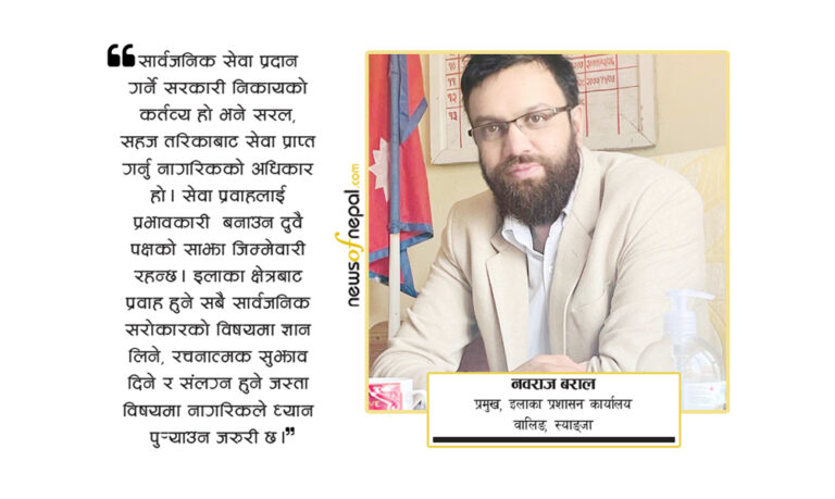 जनतालाई सहज तरिकाले सरकारी सेवा पुर्याउने तथा जवाफदेही भएका प्रशासकका रूपमा चिनिनुहुन्छ स्याङ्जाको इलाका प्रशासन कार्यालय वालिङका प्रमुख नवराज बराल । इलाका प्रशासनलाई जनउत्तरदायी बनाई जनतालाई सेवा–सुविधा दिन लागिपरेका प्रमुख बरालसँग नेपाल समाचारपत्र दैनिकका लागि स्याङ्जा संवाददाता अमृत अर्यालले गरेको कुराकानीको सम्पादित अंशः