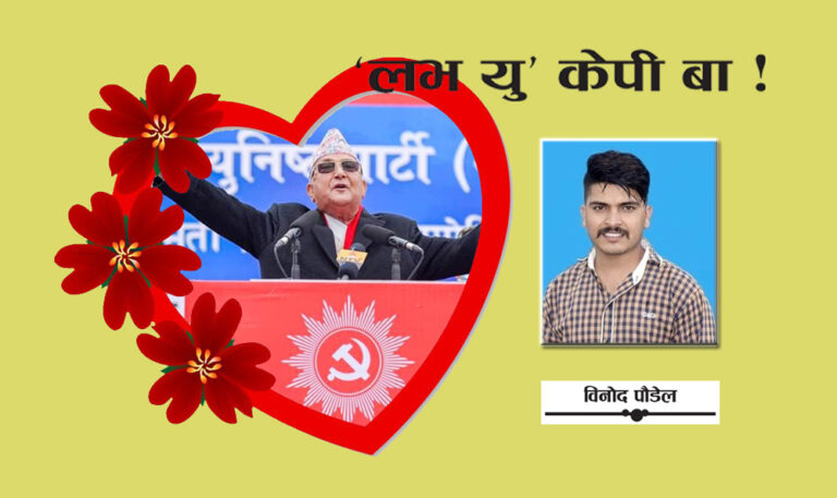 ओलीको चितवनसँग निकै आत्मीयता बढ्दै गइरहेको छ । किनकि चितवन प्रचण्डको जिल्ला, रामको जन्मस्थल हो भनी घोषणा गरेको जिल्ला, त्यही चितवनको नारायणी नदीमा ओलीले पानीजहाज चलाउने भनेर घोषणा गरेको जिल्ला, त्यसैले ओलीलाई चितवनसँग लगाव बसेको हुनुपर्छ । गर्न नसक्ने अनि आश्वासन मात्र बाँडी हिँड्ने ओलीलाई आफ्ना कार्यकर्ताले कुन अर्थमा ‘आई लभ यु केपी बा’ भन्दै नाराबाजी गरिरहेका छन् ? हे युवा हो, अलि सोचेर पो नाराबाजी गर्ने हो कि ? बिचरा युवाको मात्र के दोष, स्वस्फूर्तरुपमा केपी ओलीलाई ‘आई लभ यु केपी बा’, ‘वी लभ यु केपी बा’ भनेर भनिएको थिएन । त्यो त केपी बाका खास–खास कार्यकर्ताको झुन्डलाई घोकाउन लगाइएको थियो । जुन कार्यकर्तालाई ‘लभ यु केपी बा’ भनेर किन भनिएको भन्नेसम्म पनि थाहा छैन । उनीहरुलाई निर्देशन दिइयो, त्यसै बमोजिमको रटानलाई चिच्याउन लगाइयो । यो केपी ओलीको आत्मसन्तुष्टिको लागि मात्र थियो । चितवनको नरायणी नदीकिनारमा दशौं महाधिवेशन सम्पन्न भयो । तर न नरायणीमा पानीजहाज चलाउने कार्य सम्पन्न भएर ‘लभ यु केपी बा’ भनिएको हो, न घर–घरमा ग्यासका पाइप जोडिएको हुनाले ‘लभ यु केपी बा’ भनिएको हो । न रोजगार, शिक्षा, स्वास्थ्यको सुनिश्चितता भएर नै ‘लभ यु केपी बा’ भनिएको हो । यो त एउटा सुगा रटाइ मात्र थियो । यो राजनेता र कार्यकर्ता भनेको ‘जसो–जसो बाहुन बा उसो–उसो स्वाहा’ भनेजस्तै पो हो कि !