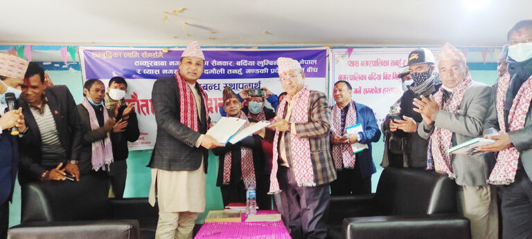 व्यास नगरपालिका दमौली तनहुँ गण्डकी प्रदेश र ठाकुरबाबा नगरपालिका सैनवार बर्दिया लुम्बिनी प्रदेशबीच मितेरी सम्बन्ध गाँसिएको छ । समृद्धिका लागि सँगसँगै भन्ने नारासहित व्यास र ठाकुरबाबा नगरपालिकाले मितेरी सम्बन्ध स्थापनार्थ सम्झौता–पत्रमा मंगलबार आदानप्रदान गरेर सम्बन्ध जोडेका छन् ।