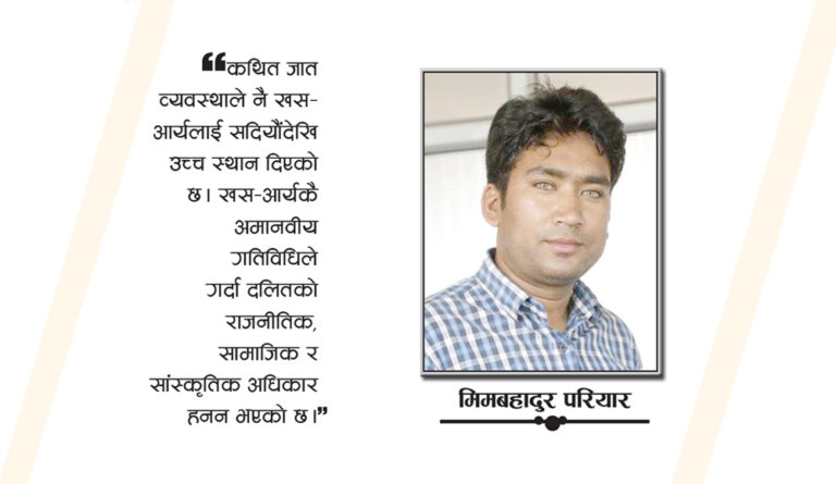 अर्को कुरा, हिन्दू धर्मका विभिन्न धार्मिक ग्रन्थ, इतिहास र दलितको उत्पति हेर्दा दलित समुदाय पनि खस–आर्य हुन् भन्ने थियो । तर नेपाली समाजको चेतले त्यसलाई पनि गलत साबित गरिदियो । खस–आर्य भनेको बाहुन–क्षत्री मात्र हुन् भन्ने बनाइदियो । राजनीतिक दलका खस–आर्य कोटाले पनि उक्त विचारको पुष्टि गर्यो ।