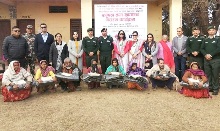 श्री नम्बर ४ बाहिनी अड्डाका बाहिनीपति सहायक रथी हरेन्द्र पाठक, सैनिक श्रीमती संघको समारोह समितिका सहसंयोजक विमु पाठक, भैरप्रसाद गणका गणपति प्रमुख सेनानी जनमत कार्की र श्रीमती प्रमिला केसी कार्की, रोयल नेपालगन्ज फुटबल क्लबका अध्यक्ष सूर्यमणि अधिकारी, उनका आमा महालक्ष्मी अधिकारी र श्रीमती प्रतिमा अधिकारी, वेस्टर्न अस्पतालका सञ्चालक डा. कल्पना थापा र छोरा राहुल थापा, श्री नम्बर ४ बाहिनी अड्डाका मेजर दीप श्रेष्ठ र श्रीमती लक्ष्मी श्रेष्ठले मंगताटोलका ७० घर–परिवारलाई एउटा कम्बल, दुई किलो चामल र दुईवटा बिस्कुट वितरण गर्नुभएको थियो ।