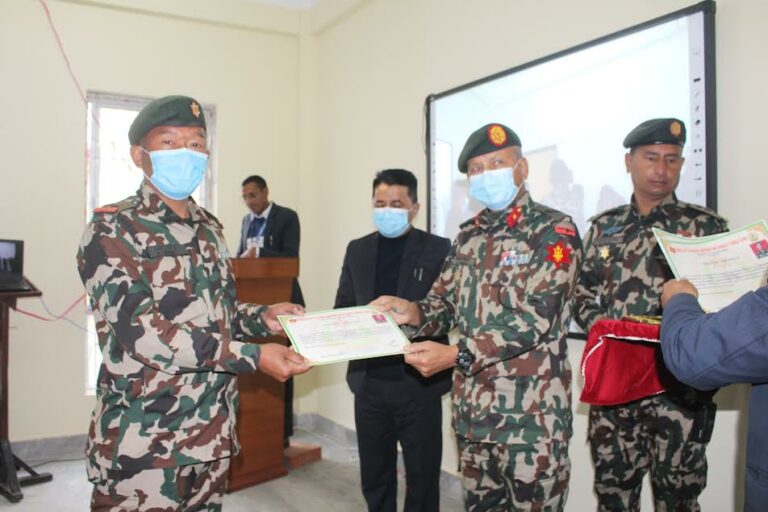 विद्यार्थीलाई नेपाली सेना कल्याणकारी योजना निर्देशनालयका निर्देशक सहायक रथी विजय थापाले प्रमाणपत्र र सीटीईभीटी गण्डकी प्रदेश कार्यालयका निर्देशक प्रमोदभक्त आचार्यले प्रमाणपत्र र मार्कसिट हस्तान्तरण गर्नुभएको थियो । विद्यार्थीलाई नेपाली सेना कल्याणकारी योजना निर्देशनालयका निर्देशक सहायक रथी विजय थापाले प्रमाणपत्र प्रदान गर्नुभएको थियो । उहाँले विद्यार्थीलाई तालिममा सिकेका सीप र ज्ञान आफ्नो व्यवसायमा लागू गर्न अनुरोध गर्नुभएको थियो । नेपाली सेनाको कल्याणकारी योजनाअनुसार सैनिक र गैरसैनिकका सन्तानलाई आत्मनिर्भर र स्वरोजगार बनाउने उद्देश्यले सीप प्रदान गर्दै आएको आचार्यले बताउनुभयो ।