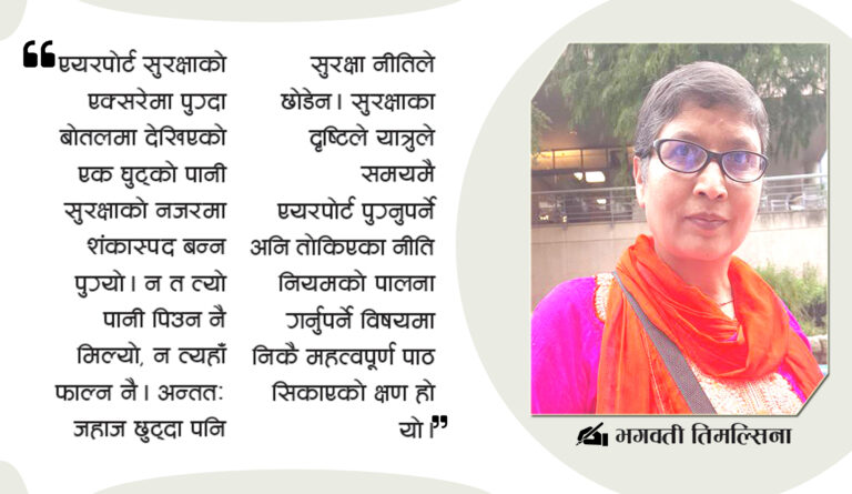 सुरक्षा गेटभन्दा बाहिरै पानी पिउँदापिउँदै बोतलमा एक घुट्को पानी बाँकी रहेछ । बोतल मात्र होला भनी एयरपोर्ट सुरक्षाको एक्सरेमा पुग्दा बोतलमा देखिएको एक घुट्को पानी सुरक्षाको नजरमा शंकास्पद बन्न पुग्यो । न त त्यो पानी पिउन नै मिल्यो, न त्यहाँ फाल्न नै । अन्ततः जहाज छुट्दा पनि सुरक्षा नीतिले छोडेन । सुरक्षाका दृष्टिले यात्रुले समयमै एयरपोर्ट पुग्नुपर्ने अनि तोकिएका नीति नियमको पालना गर्नुपर्ने विषयमा निकै महत्वपूर्ण पाठ सिकाएको क्षण हो यो ।