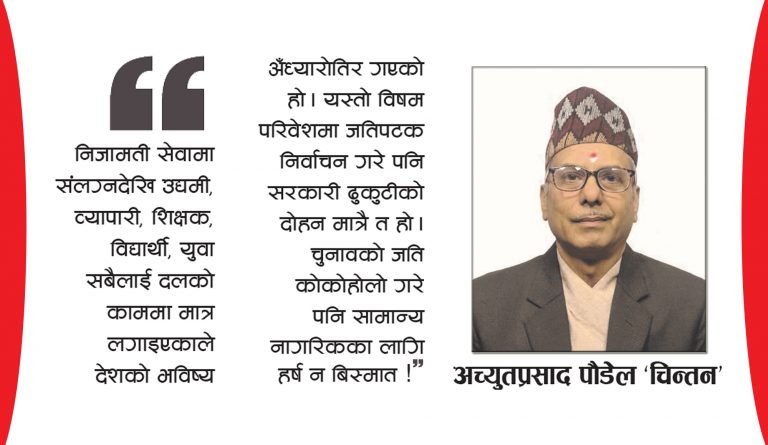 यहाँ सिद्धान्त र निष्ठा छैन । दलका असावधानीका कारण देशको कृषिमा भएको लगानी बालुवामा हालेको पानीजस्तै भएको छ । विगत ५ वर्षको धान उत्पादनको रेसियो हेर्दा घटेको देखिन्छ । खाने मुख बढ्ने तर चामल उत्पादनको क्रम घट्ने स्थितिको कारण के बेमौसमी वर्षा मात्रै हो कि बेमौसमी राजनीति पनि ? किसानहरुलाई सधैँ दलको काममा खटाउनाले कृषि उब्जा घटेको हो । निजामती सेवामा संलग्नदेखि उद्यमी, व्यापारी, शिक्षक, विद्यार्थी, युवा सबैलाई दलको काममा मात्र लगाइएकाले देशको भविष्य अँध्यारोतिर गएको हो । यस्तो विषम परिवेशमा जतिपटक निर्वाचन गरे पनि सरकारी ढुकुटीको दोहन मात्रै त हो । चुनावको जति कोकोहोलो गरे पनि सामान्य नागरिकका लागि हर्ष न बिस्मात !