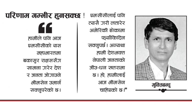 महाभारतको घटना कथा सङ्क्षेपमा यही हो । हामीले पनि आज एमसीसीको यस महाभारतमा बकासुर राक्षससँग सामना गरेर देश र जनता जोगाउने भीमसेन उमार्न सक्नुपरेको छ । एमसीसीलाई पनि त्यसै गरी लतारेर अमेरिकी ढोकामा फ्याँकिदिन सक्नुपर्छ । अन्यथा हामी देशभक्त नेपाली जनताको जीउ–धन खतरामा छ । हो, हामीलाई आज भीमसेन चाहिएको छ । हाम्रो भीमसेन अरु कोही होइन, वीरप्रसू नेपाल आमाका देशभक्त छोराछोरीहरु नै हुन् ।