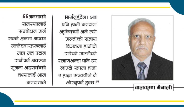 आम मतदातासमक्ष अहिले आएर एउटा गम्भीर प्रश्न खडा भएको छ । त्यो के हो भने, अब निर्वाचनको विषयलाई लिएर कुनै पनि दलको प्र्रतिनिधि वा स्वतन्त्रै व्यक्ति भए पनि मत माग्न आएका बखत ती उम्मेदवारसमक्ष केही गम्भीर प्रश्नहरु आम मतदाताहरुले राख्नै पर्दछ । जुन स्थानको लागि जनप्रतिनिधिको लागि मत माग्न आएका हुन्छन्, सम्बन्धित स्थानीयवासीले त्यो मत माग्न आउने उम्मेदवारको नालीबेली पत्ता लगाउनै पर्दछ र त्यसको जानकारी सबै स्थानीय मतदाताहरुसमक्ष पुर्याउनै पर्दछ । यदि यो कुरामा अब पनि स्थानीय मतदाता चुकेमा त्यसको गम्भीर परिणाम भोग्नुपर्ने हुन्छ । यस मानेमा अहिलेदेखि नै आफ्नो मनस्थितिलाई जो जुन दल वा स्वतन्त्रबाट उठेको भए तापनि उम्मेदवारको विषयमा दलको चिह्न मात्र नहेरी उम्मेदवारकै विषयमा व्यापक सोधखोज र अनुसन्धान गरेर जनताको समस्यालाई सम्बोधन गर्न सक्ने क्षमता भएका उम्मेदवारहरूलाई मात्र मत प्रदान गर्नुपर्ने अवस्था सृजना भइसकेको तथ्यलाई आम मतदाताले बिर्सनुहुँदैन । अब पनि हामी मतदाता झुक्कियौं भने त्यो गल्तीको सजाय विगतमा हामीले गरेको गल्तीको सजायभन्दा पनि डर लाग्दो रूपमा हामी र हाम्रा सन्ततीले नै भोग्नुपर्ने हुन्छ ।
