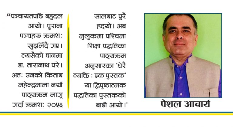 हाइस्कुलमा मात्रै यो पद्धति बसेन । क्रमशः पछि–पछि ११/१२ कक्षामा समेत यही पद्धति अक्षरशः नक्कल गरियो । पुराना र स्थापित लेखकहरूलाई पाठ्यक्रमबाट भटाभट फालियो । ‘राम्रा होइन हाम्राहरू’ रातारात चर्चित बनाइए । डा. तारानाथ शर्माका एउटा पनि रचना त्यसपछि सरकारी स्कुलमा राखिएनन् । यो भनेको ‘पञ्चायतमा हालिमुहाली गर्ने लेखकलाई बहुदलमा किन चान्स दिने’ भन्ने सोचले बायस भएरै हो । वि.सं. २०७७ बाट भर्खर ‘घनघस्याको उकालो काट्दा’ नियात्रा १२ कक्षामा राखियो । कतै–कतै निजी स्कुलले उनको सम्मान खातिर उनका निबन्ध र नियात्रालाई स्थान दिइरहेकै थिए ।