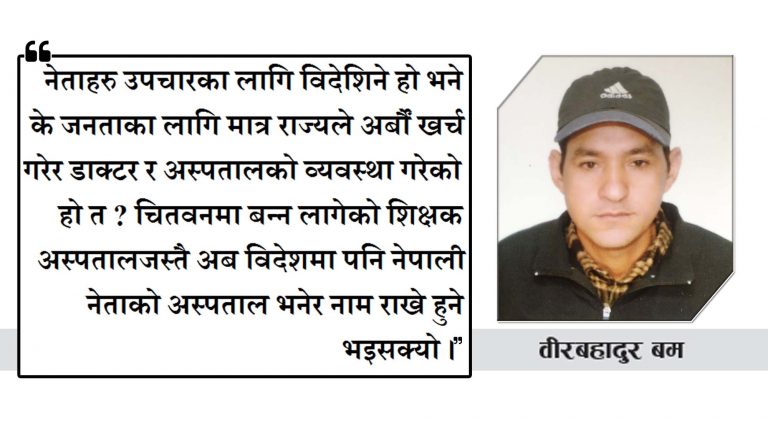 नेताहरु उपचारका लागि विदेशिने हो भने के जनताका लागि मात्र राज्यले अर्बौं खर्च गरेर डाक्टर र अस्पतालको व्यवस्था गरेको हो त ? चितवनमा बन्न लागेको शिक्षक अस्पतालजस्तै अब विदेशमा पनि नेपाली नेताको अस्पताल भनेर नाम राखे हुने भइसक्यो । स्वदेशी स्वास्थ्य उपचारलाई प्रश्रय नदिने हो भने देशको अर्बौं रुपियाँ खोलो बगेझैँ विदेशतिर बगिरहनेछ । यस्तो प्रवृत्तिलाई रोक्ने हो भने औषधि उपचारका लागि नेपाल नै भरपर्दो र सक्षम बन्नेछ । साथै नेपाली स्वास्थ्यकर्मीसमेत दक्ष र क्षमतावान् हुने बाटो खुल्नेछ । विदेशीले समेत नेपालको स्वास्थ्य सेवाको प्रशंसा गर्नेछन् अनि नेपाली नेताको गौरव र स्वाभिमान उच्च हुनेछ ।