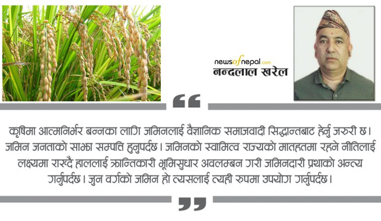 मुलुकमा भूमि वितरण प्रणालीमा सामन्ती राज्य व्यवस्थाको प्रभाव जर्जर रुपमा कायम छ । हालसम्म पनि कृषिक्षेत्रमा समस्या असली रुपमा पहिचान हुन सकेको छैन । समस्या हल गर्ने कुरा त टाढाकै रह्यो । वैज्ञानिक समाजवादी सिद्धान्तबाट हेर्दा जमिन जनताको साझा सम्पत्ति हुनुपर्दछ । जमिनमाथि ठूला दलाल पुँजीपतिहरुको एकाधिकार कायम छ । अभैm पनि एक चौथाइ किसानको आफ्नो जमिन छैन । राज्यले कुल वार्षिक बजेटको अत्यन्त न्यून रकम कृषिमा लगानी गर्दै आएको छ । जनसंख्या बढ्दो छ, तर उत्पादकत्व बढेको छैन । कृषिको मुख्य उत्पादन धानलाई मुलुकको अर्थतन्त्रको मेरुदण्डसँग जोडिएको छ । जुन वर्ष धानको उत्पादन घट्छ, त्यो वर्ष कुल ग्रार्हस्थ्य उत्पादनको अवस्था पनि खुम्चिन्छ । देशमा साना–ठूला गरी ६ हजारभन्दा बढी नदीनाला बग्छन् । तर किसानका लागि त्यो वरदान हुन सकेको छैन । देशमा उपलब्ध जमिनमा सिंचाइ सुविधा पुर्याउन सकिन्छ । देशमा प्रशस्त खाद्यान्न उत्पादन हुनु भनेको जनताको आर्थिक स्थिति, जीवनस्तर माथि उठ्नु हो । जुन देशमा हरक्षण जनता गाँस, बास र कपासले पिरोलिन्छन्, त्यस देशको प्रगति कहिल्यै हुँदैन । वस्तुमा मात्र हामी आत्मनिर्भर हुन सके अर्थतन्त्रको अहिलेको प्रमुख समस्या व्यापार घाटा कम गर्न सहयोग गर्नेछ ।