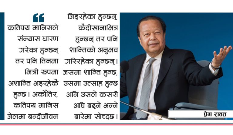 यो कुनै समाधान होइन । अनि, के हासिल भयो र ! पैसा कमाउनका लागि मानिसहरू समर्पित हुन्छन् । त्यसबाट केही पनि हुने होइन, किनभने त्यो आफ्नै साथमा जाने वस्तु होइन । त्यो कोही अर्कैको हुनेछ । युद्ध– जसमा यतिका धेरै पैसा खर्च हुन्छ । विज्ञानको ऊर्जालाई यति धेरै खर्चेर पनि यसबाट केही भइरहेको छैन । यद्यपि, एउटा महत्त्वपूर्ण कुरा ‘शान्ति’ का लागि हामीले कोशिश गरेनौँ ! वृद्धावस्थामा पुगेपछि, अवकाश लिएपछि मात्रै शान्तिका बारेमा सोच्नेछु भनेर हाम्रो ध्यान त्यतातिर जाने गर्दछ । तर, समृद्धिको अर्थ के हो– पैसा पनि होओस्, राम्रो स्वास्थ्य होओस् अनि शान्ति पनि होओस् । शान्तिको अभावमा त्यो समृद्धि अधुरो रहन्छ ।