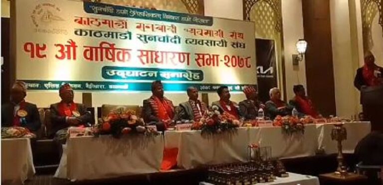 सुनचाँदी व्यवसायी संघ काठमाडौंको १९ औं साधारणसभा सम्पन्न भएको छ । संघका अध्यक्ष शुरेसमान शाक्यको सभापतित्वमा साधारणसभा सम्पन्न भएको हो । संघीय मामिला तथा सामान्य प्रशासन मन्त्री राजेन्द्र श्रेष्ठको प्रमुख आतिथ्यतामा सो कार्यक्रम सम्पन्न भएको थियो । त्यसक्रममा मन्त्री श्रेष्ठले व्यवसायीका माग सम्बोधन गर्न आफू तयार रहेको बताउनुभयो ।