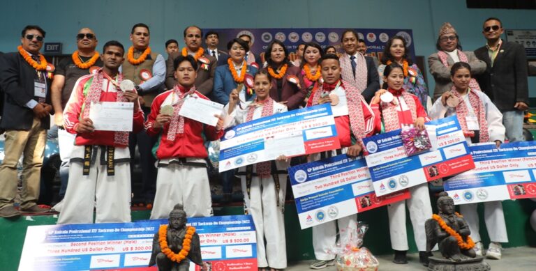 नेपाल आर्मीका दिनेश बुढा मगर र बाग्मती प्रदेशकी रूबिका खड्का जिपी कोइराला स्मृति प्रोफेसनल आईटीएफ तेक्वान्दो च्याम्पियनसिपमा आइतबार च्याम्पियन बनेका छन् । त्रिपुरेश्वरस्थित राष्ट्रिय खेलकुद परिषद् (राखेप) कभर्डहलमा भएको पुरुष ५५–६३ केजी फाइनलमा दिनेशले आफ्नै विभागका प्रमोद साहुलाई पराजित गरे । आर्मीकै प्रेम मगर तेश्रो भए । सेमिफाइनलमा दिनेशले बाग्मतीका निर्मल तामाङ तथा प्रमोदले आर्मीका प्रेम मगरलाई हराउँदै उपाधि भिडन्त पक्का गरेका हुन् ।