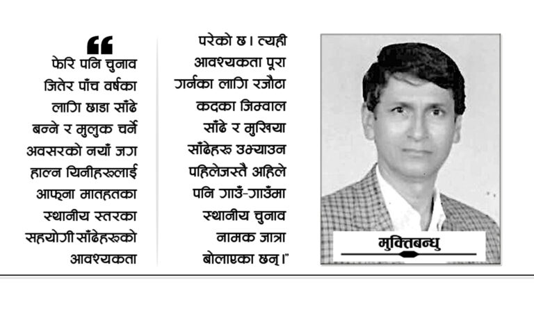 मुलुक सकाउने प्रायोजित ठेक्कापट्टाका अभियानमा मरिहत्ते गर्दै लागिपरेका छन् । विदेशी प्रभुहरुलाई यथेष्ट सेवा–सहयोग पुर्याउन तँछाडमछाड गर्दै दगुरेका छन् । फेरि पनि चुनाव जितेर पाँच वर्षका लागि छाडा साँढे बन्ने र मुलुक चर्ने अवसरको नयाँ जग हाल्न यिनीहरुलाई आफ्ना मातहतका स्थानीय स्तरका सहयोगी साँढेहरुको आवश्यकता परेको छ । त्यही आवश्यकता पूरा गर्नका लागि रजौटा कदका जिम्वाल साँढे र मुखिया साँढेहरु उभ्याउन पहिलेजस्तै अहिले पनि गाउँ–गाउँमा स्थानीय चुनाव नामक जात्रा बोलाएका छन् । जे छ साँढे बन्ने/बनाउने खेल नै छ । मुलुक बेच्ने/बेचाउने खेल नै छ । यी यस्ता नेता–कार्यकर्तासँगै यो मुलुकमारा व्यवस्थालाई नै जनताले भीमसेन लात ठोक्नुपर्ने । खै जनतामा त्यो चेतना अभैm उघ्रेको छैन । यसैमा दुःख लागेको छ ।’