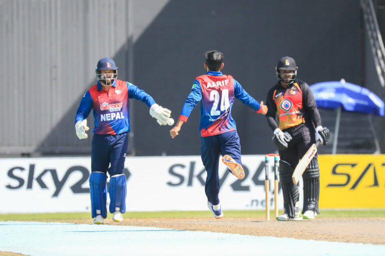 नेपालका लागि सोमपाल कामी,कमलसिंह ऐरी र दिपेन्द्रसिंह ऐरीले समान दुई विकेट तथा पवन सराफ र कप्तान सन्दीप लामिछानेले समान एक विकेट लिए ।