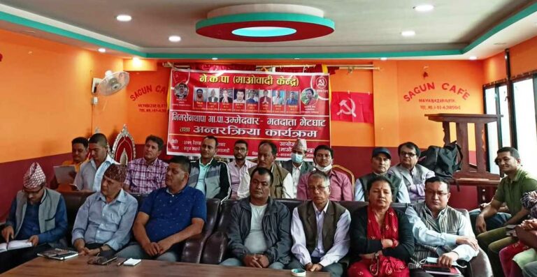 माओवादी केन्द्र भिमसेन थापा गाउँपालिकाका उम्मेदवारहरूले काठमाडौंमा रहेका आफ्ना मतदाताहरूसँग भेटघाट तथा अन्तरक्रिया कार्यक्रम गरेका छन् । उम्मेदवारले आगामी योजना र विकास निर्माण सम्बन्धि आफ्ना साझा धारणासमेत प्रस्तुत गरेका हुन् ।