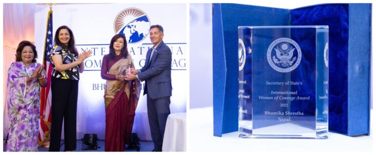 नागरिक सुरक्षा, लोकतन्त्र तथा मानव अधिकारसम्बन्धी अमेरिकी उपविदेशमन्त्री उजरा जेयाको उपस्थितिमा यौनिक तथा लैंगिक अल्पसंख्यक अभियानकर्मी भुमिका श्रेष्ठलाई अन्तर्राष्ट्रिय साहसी महिला पुरस्कार हस्तान्तरण गरिएको छ ।