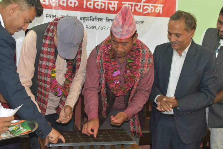 रामेछाप बहुप्राविधिक शिक्षालयको सहकार्यमा सञ्चालित यस कार्यक्रमको पहिलो दिन आज मन्थली नगरपालिकाका नगरप्रमुख लव श्रेष्ठको सम्बोधनसहित प्राविधिक शिक्षालयमा कृषि पशु तथा बालि बिज्ञान अध्ययनन गरिरहेका पचास जना विद्यार्थीहरुको समुहलाई प्रशिक्षण तथा अभिमुखीकरण गर्ने कार्यक्रम सम्पन्न भएको छ ।