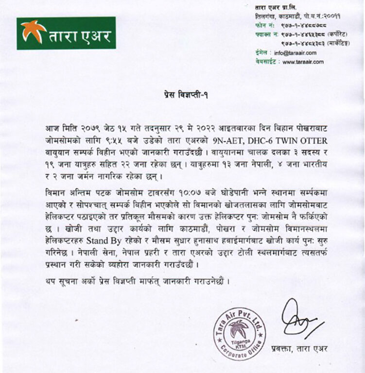 तारा एयरले विज्ञप्ति जारी गर्दै हराइरहेको जहाज खोजी तथा उद्धारका लागि काठमाडौं, पोखरा र जोमसोम विमानस्थलमा हेलिकप्टरहरू स्ट्यान्डबाइ राखिएको जनाएको छ । मौसममा सुधार आएपछि खोजीकार्य पुनः सुरु गरिने तारा एयरले जनाएको छ ।