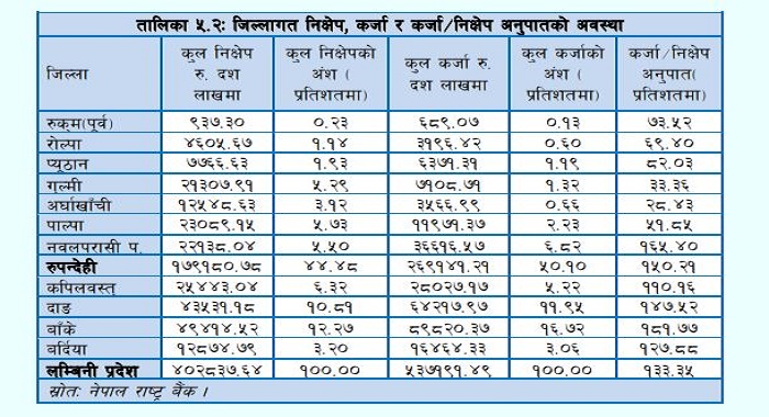 केन्द्रीय बैंकको विवरणअनुसार कपिलवस्तुको हिस्सा ६.३२ प्रतिशत रहेको छ । सो जिल्लाका नागरिकले रु २५ अर्ब ४४ करोड ३० लाख ४० हजार बराबरको निक्षेप बैंक तथा वित्तीय संस्थामा राखेका छन् । लुम्बिनी प्रदेशको पाल्पाको हिस्सा ५.७३ प्रतिशत मात्रै छ । त्यो भनेको कूल रु २३ अर्ब आठ करोड ९१ लाख ५० हजार बराबरको निक्षेप पाल्पावासीले बैंक तथा वित्तीय संस्थामा राखेका छन् ।