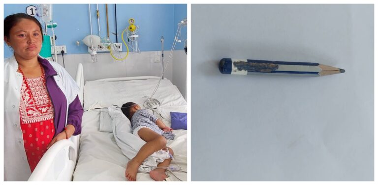 धुलिखेल अस्पताल र डाक्टरहरुको अथक मेहनतले बच्चाले पुर्नजिवन प्राप्त ग-यो ।’ डा. आभाकिरण केसीले बच्चालाई अप्रेसनका लागि तयारी गरिएको आधा घण्टामै पेन्सिल निकाल्न सकिएको बताउनु भयो । श्वास नलीमा भएकाले बच्चालाई खतरा थियो ।