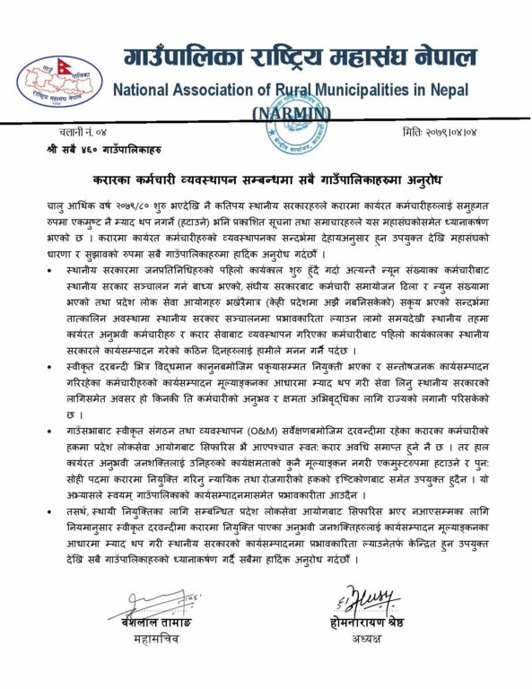 ‘स्थायी नियुक्तिका लागि सम्बन्धित प्रदेश लोकसेवा आयोगबाट सिफारिस भएर नआएसम्मका लागि नियमानुसार स्वीकृत दरवन्दीमा करारमा नियुक्ति पाएका अनुभवी जनशक्तिहरुलाई कार्यसम्पादन मूल्याङ्कनका आधारमा म्याद थप गरी स्थानीय सरकारको कार्यसम्पादनमा प्रभावकारिता ल्याउनेतर्फ केन्द्रित हुन उपयुक्त देखि सबै गाउँपालिकाहरुको ध्यानाकर्षण गर्दै सबैमा हार्दिक अनुरोध गर्दछौं’, विज्ञप्तिमा भनिएको छ ।