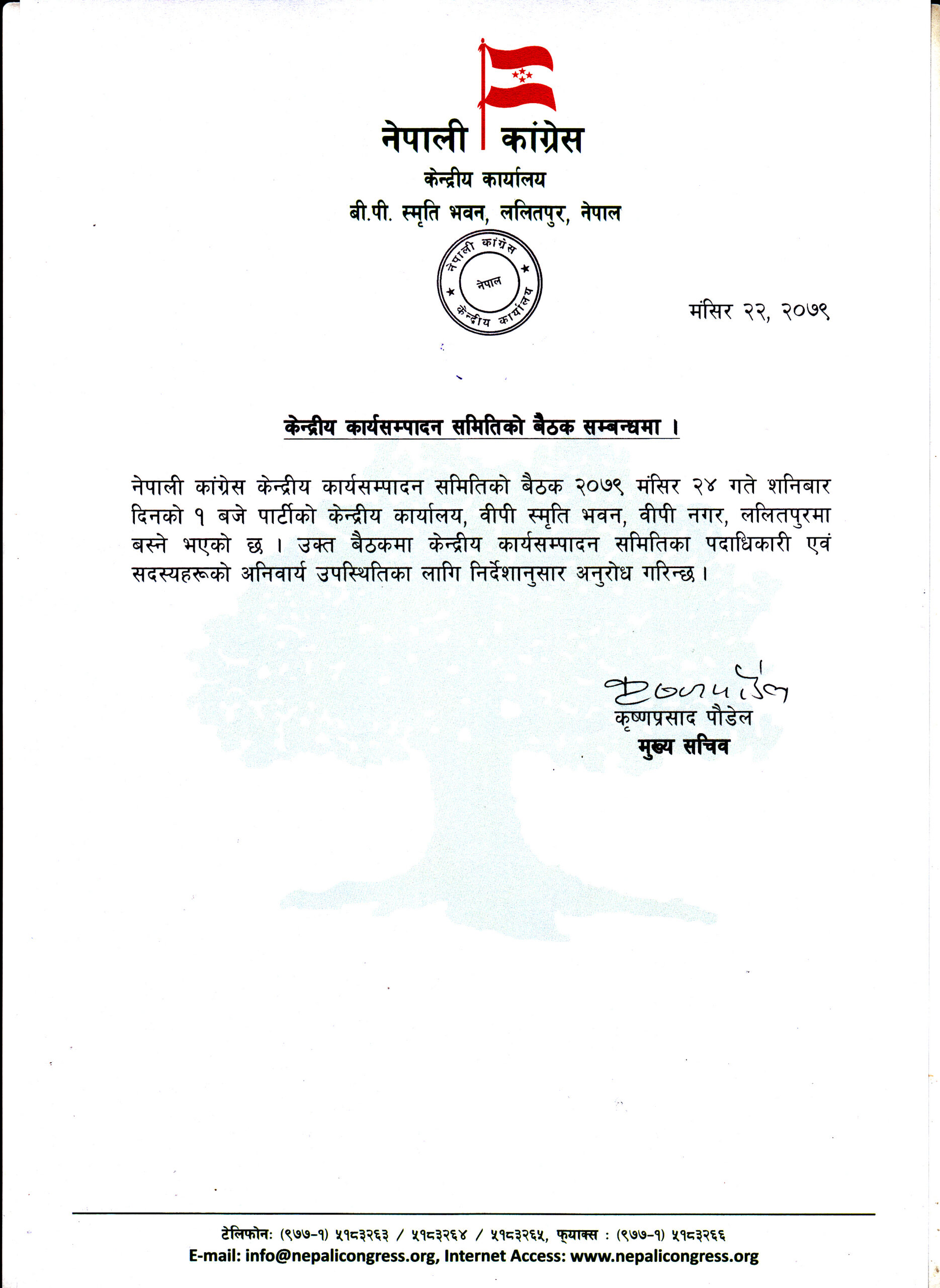 आज (बिहीबार) कांग्रेस मुख्य सचिव कृष्णप्रसाद पौडेलले दिएको जानकारी अनुसार उक्त बैठक आगामी शनिबार दिउँसो १ बजे पार्टी कार्यालय वीपी स्मृति भवन ललितपुरमा बस्ने छ ।
