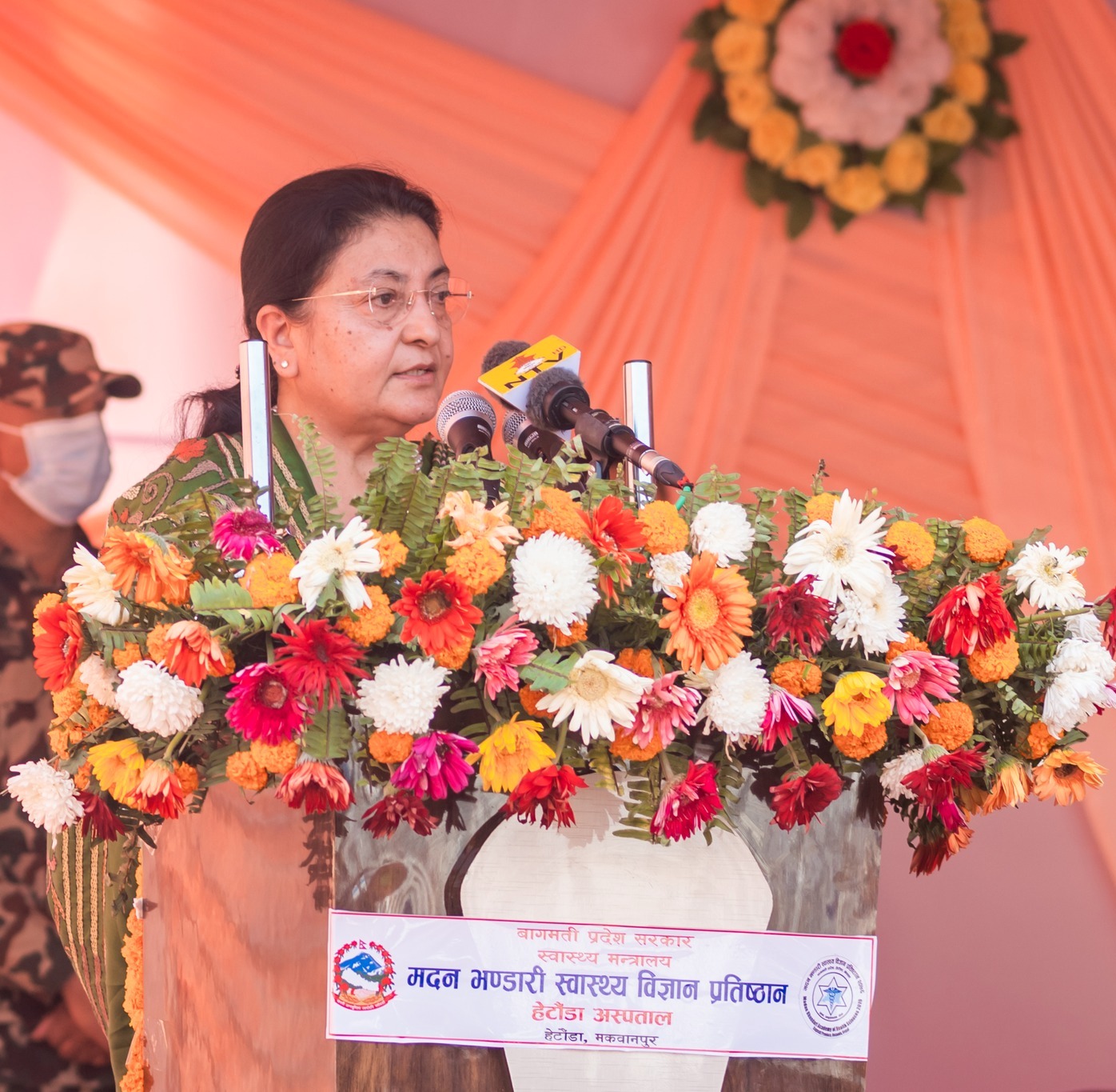 भवन उद्घाटन गर्दै राष्ट्रपति भण्डारीले नेपालको संविधानमा नागरिकका लागि सुनिश्चित स्वास्थ्य सेवाको अधिकार लागु गराउन प्रतिष्ठानले टेवा पु¥याउने बताउनुभयो । उहाँले जनताको स्वास्थ्यका निमित्त स्वास्थ्य क्षेत्रमा विकास हुनु जरुरी रहेको भन्दे प्रतिष्ठानद्वारा सञ्चालित अस्पतालबाट हेटौंडा र आसपासका क्षेत्रका बिरामीको सेवा र गुणस्तरीय स्वास्थ्य जनशक्ति उत्पादनमा विशेष पहलकदमी आवश्यक रहेको बताउनुभयो ।