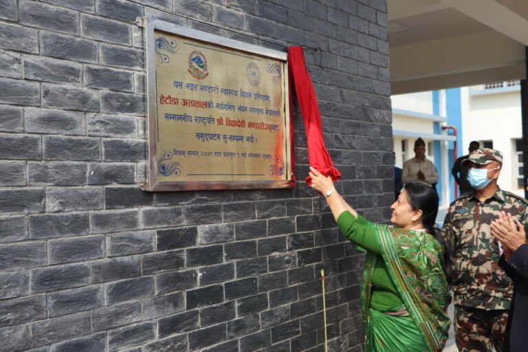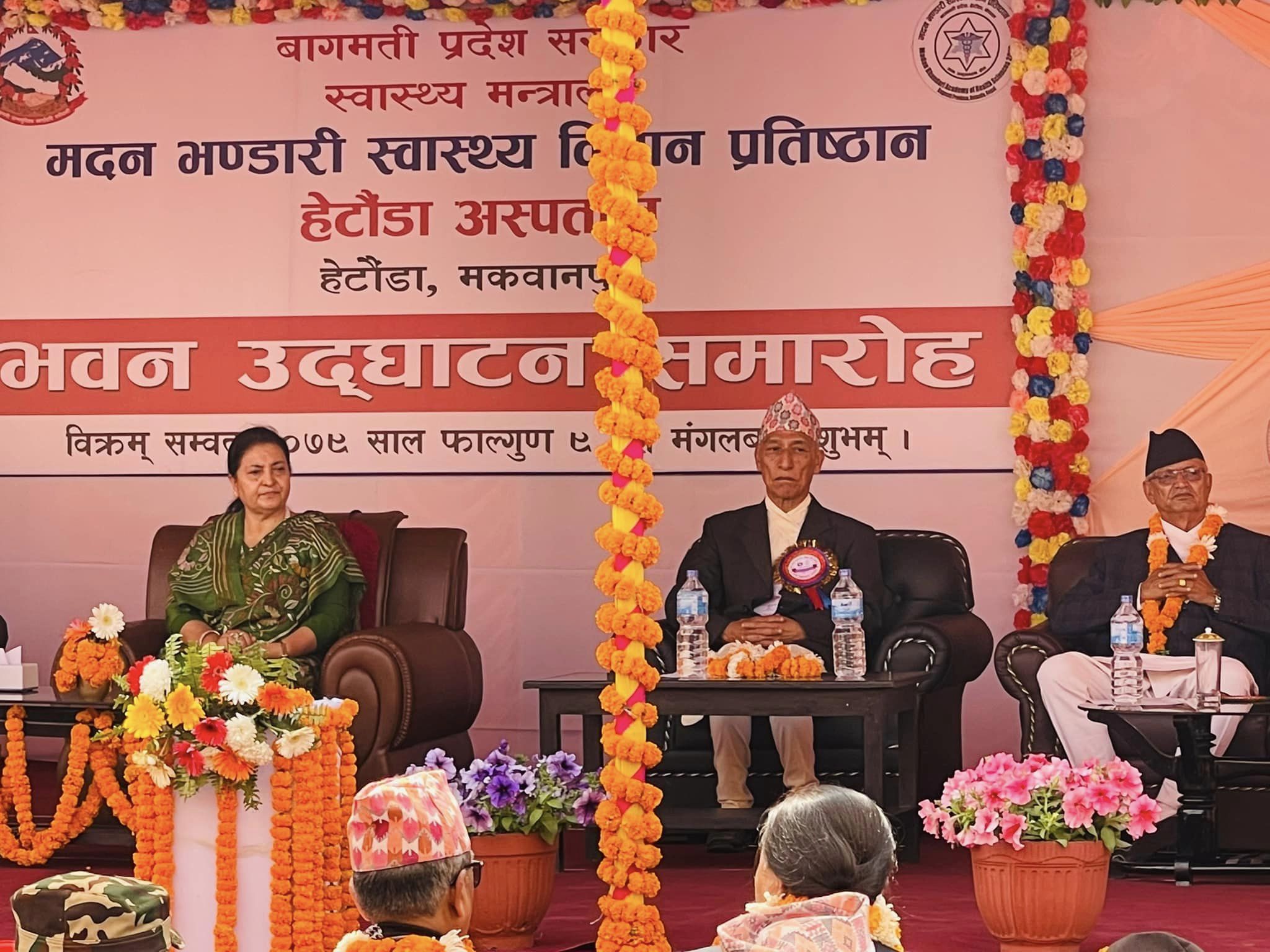 हेटौंडामा मदन भण्डारी स्वास्थ्य विज्ञान प्रतिष्ठानअन्तर्गत् हेटौंडा अस्पतालको नयाँ भवन उद्घाटन गरिएको छ । राष्ट्रपति विद्यादेवी भण्डारीले भवन उद्घाटन गर्नुभएको हो । संघीय सरकारको ४३ करोड लागतमा निर्माण भएको ३ तीनतले भवनको राष्ट्रपति भण्डारीले मंगलबार उद्घाटन गर्नुभयो ।