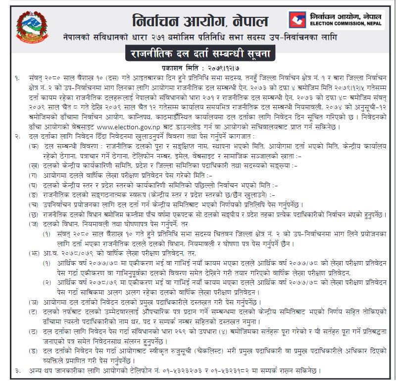 निर्वाचन आयोगले उपनिर्वाचनमा भाग लिन इच्छुक राजनीतिक दललाई दर्ताका लागि आब्हान गरेको छ । बैशाख १० गते बारा–२ र तनहुँ–१ मा हुन गईरहेको उपनिर्वाचनको प्रयोजनका लागि चैत ८ देखी चैत १२ गतेको समयसिमा तोकेर दर्ताका लागि आब्हान गरेको हो ।