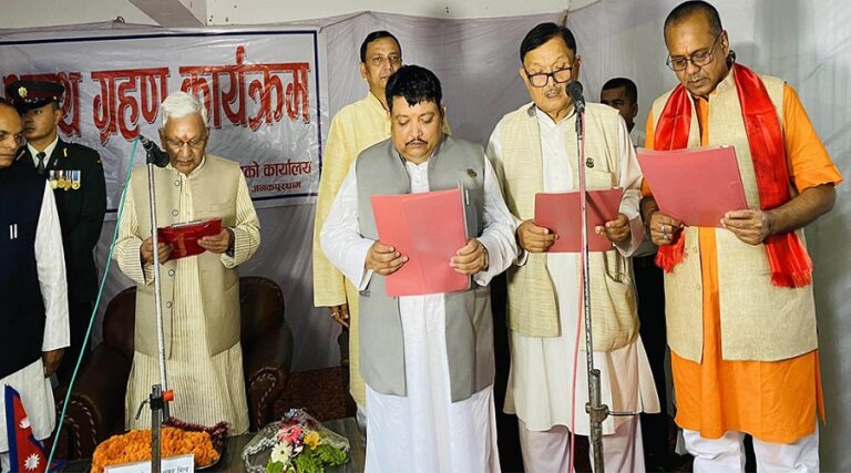 आज मधेश भवनमा आयोजित एक विशेष समारोहमा प्रदेश प्रमुख हरिशङ्कर मिश्रसमक्ष तीनै जना मन्त्रीले पद तथा गोपनीयताको शपथ लिए।