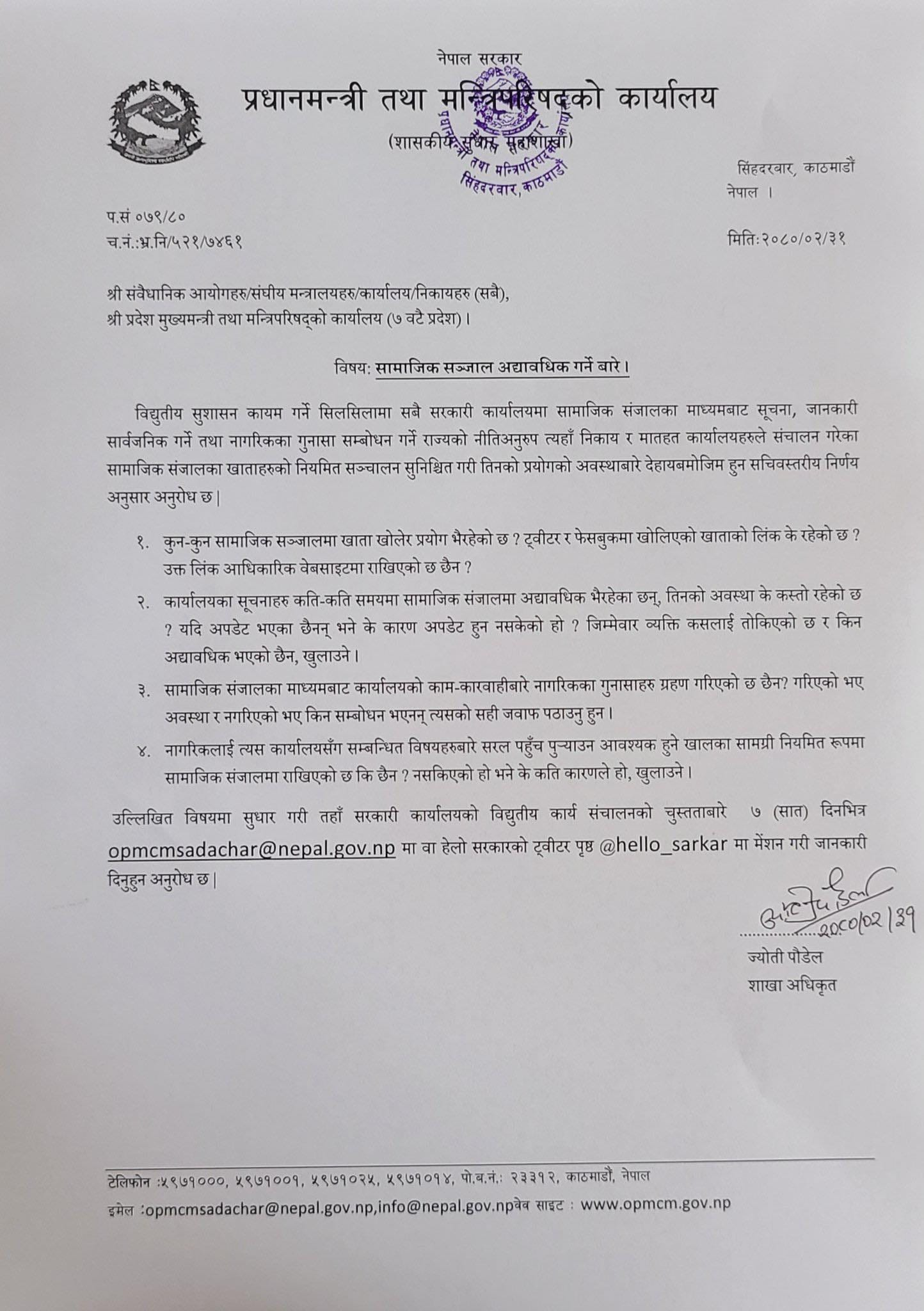 प्रधानमन्त्री तथा मन्त्रिपरिषद्को कार्यालयले विद्युतीय सुशासन कायमका लागि सबै सरकारी कार्यालयको सामाजिक सञ्जालको खाता नियमित सञ्चालनको सुनिश्चित गर्न निर्देशन दिएको छ।
