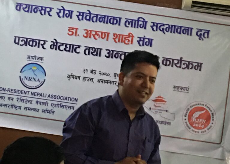 मर्न डर नलाग्ने मान्छे कोही छ ? सत्य कुरा यही हो मृत्युलाई कसैले जित्न सक्दैन । तर, मृत्यु अकालमा आउनु हुँदैन । नेपालमा प्रत्येक महिना ४० हजार मानिसको क्यान्सर रोगको कारण अकालमा मृत्यु भइराखेको छ । हामी जे कुरा देखाउँदा पनि अमेरिका युरोपलाई देखाउँछौ आफ्नै देशको चिकित्सकलाई विश्वास गरिन्न । हामीलाई हाम्रो जीवन प्रकृतिको नियम अनुसार बाच्नुपर्छ । यसका लागि डाक्टर मात्र लागेर हुन्न सबै जना लाग्नुपर्छ । क्यान्सर रोग सुरुकै अवस्थामा पहिचान गरेर उपचार गरियो भने नेपालमै निको हुन्छ तर, बिरामीले नै विश्वास नगर्ने परम्परा अझै कायमै छ । ‘क्यान्सर सचेतनाका लागि सद्भावना दूत डा. अरुण शाहीसँग पत्रकार अन्तरक्रिया’ कार्यक्रममा मेडिकल अंकोलोजिष्ट शाहीले भन्नुभयो ।