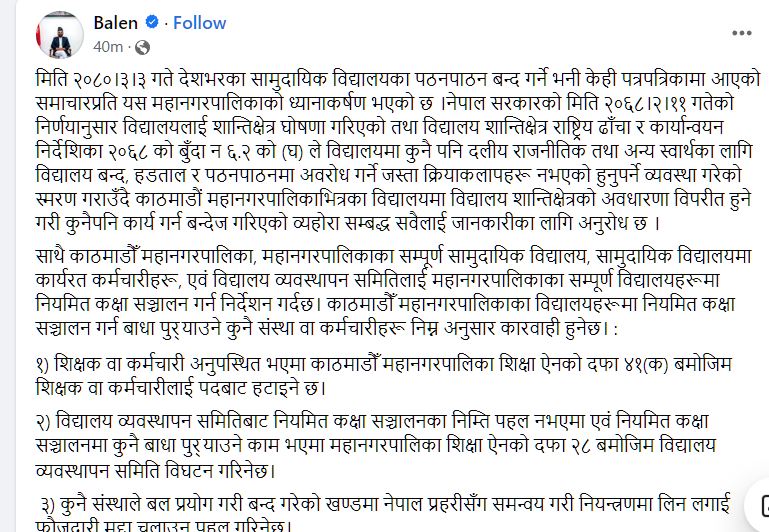 काठमाडौँ महानगरपालिकाका मेयर बालेन्द्र साहले विद्यालय बन्द गर्ने कर्मचारीलाई पदबाट हटाउने चेतावनी दिनुभएको छ । देशभरका सामुदायिक विद्यालयमा काम गर्ने कर्मचारीले भोलि आइतबारबाट विद्यालय बन्द गर्ने निर्णय गरेपछि मेयर साहले उक्त चेतावनी दिनुभएको हो ।